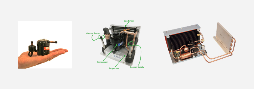 초소형 냉동압축기를 사용 한 냉각장치로서 발열 부품 또는 장치에 직접 접촉을 통해 냉각 및 방열하는 장치이며 소형냉매압축기, 열교환기 , 공기용 송풍기 등으로 구성 되어 있다.